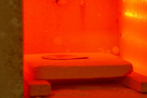 The metal with the enamel covering all the piece is placed in the kiln to be fired for a few minutes.