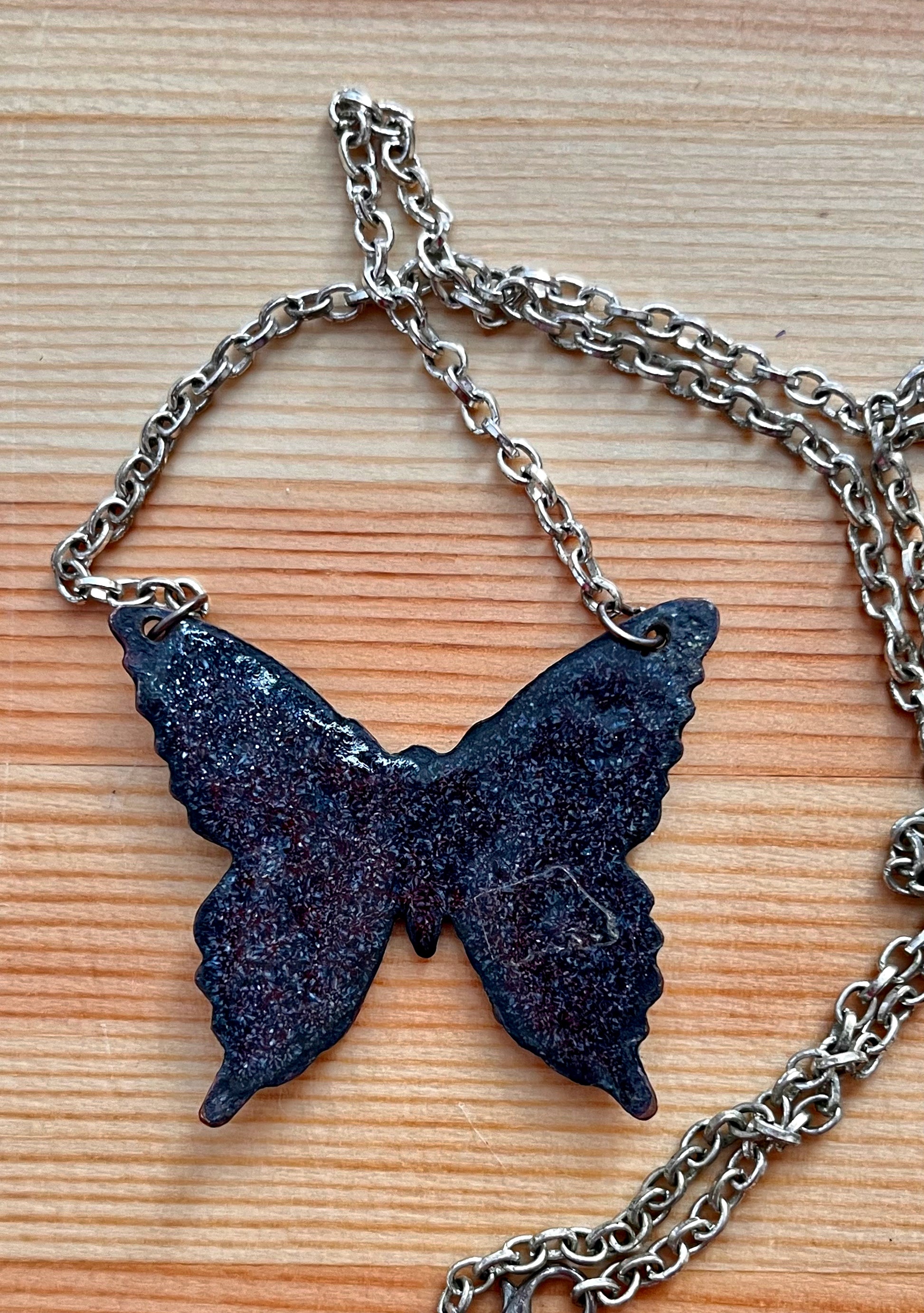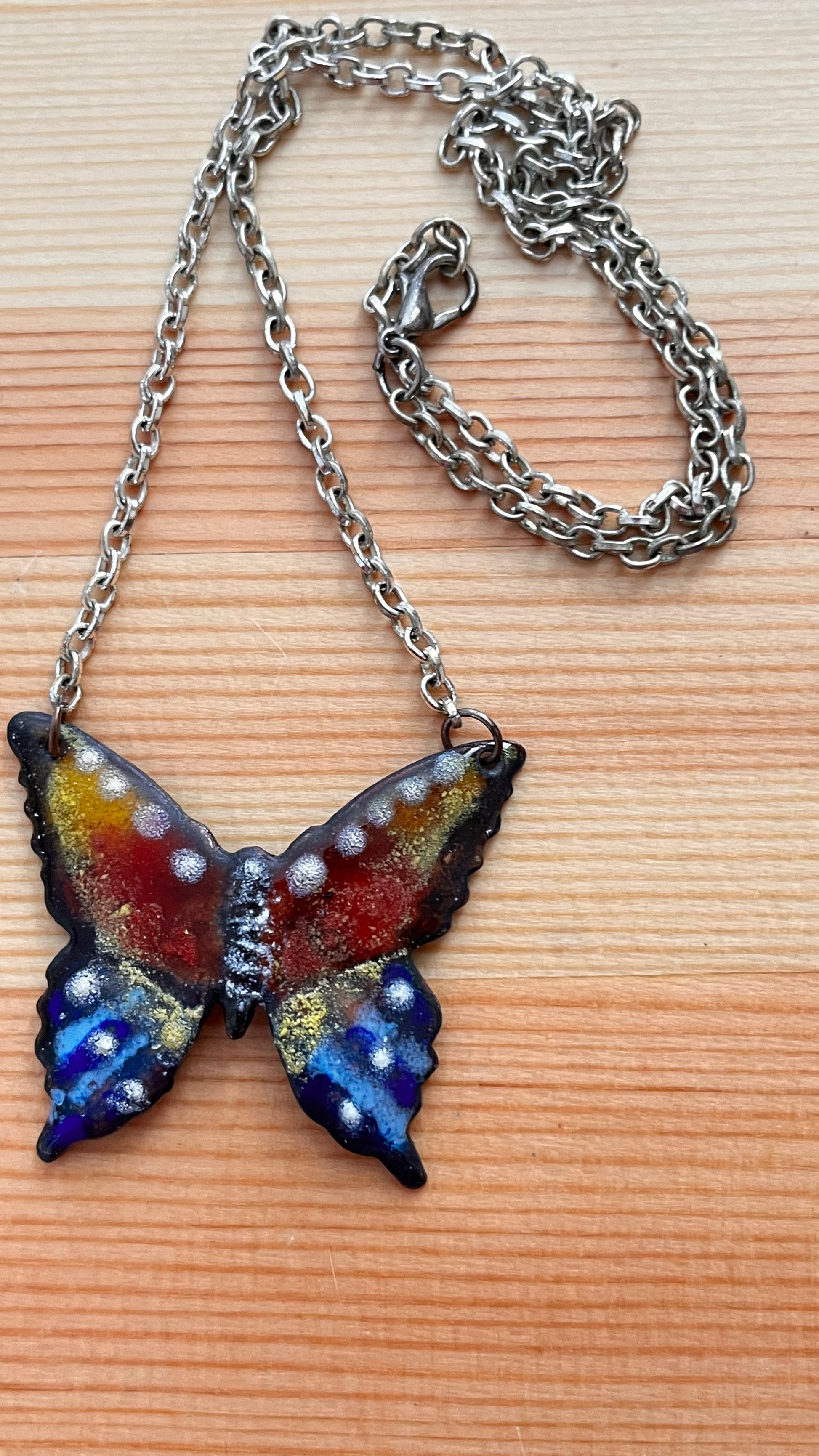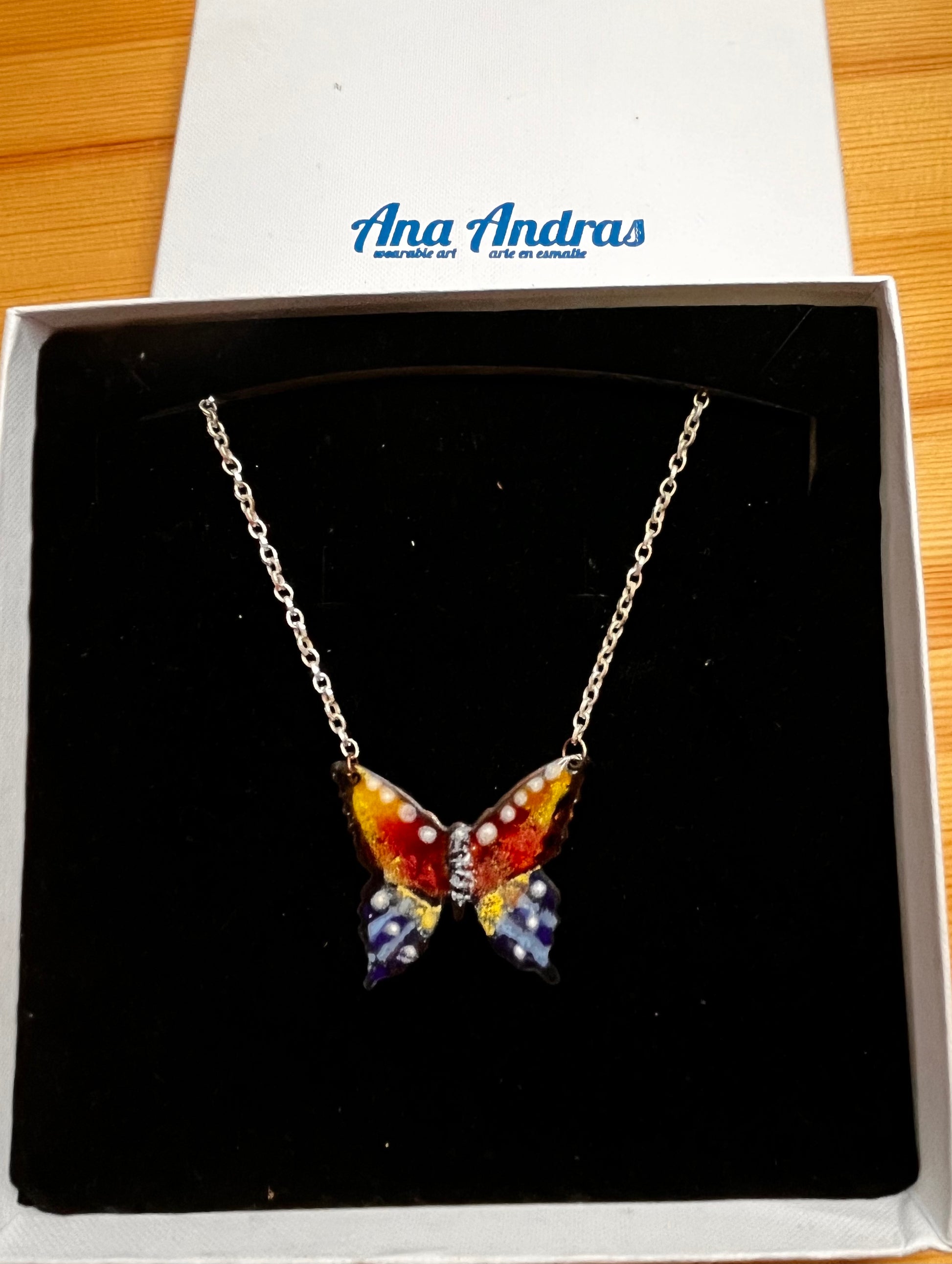 This buterfly was handcrafted completely from cutting the copper to give the shape to apply the fired enamel on the surface and fuse it into the metal at 1500 degrees F.