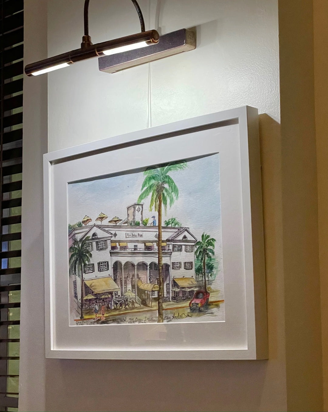 Painting created on site, with the life around the hotel and the pedestrian in Ocean Drive. Painting with ink and watercolor on watercolor paper, mounted on white board and framed.