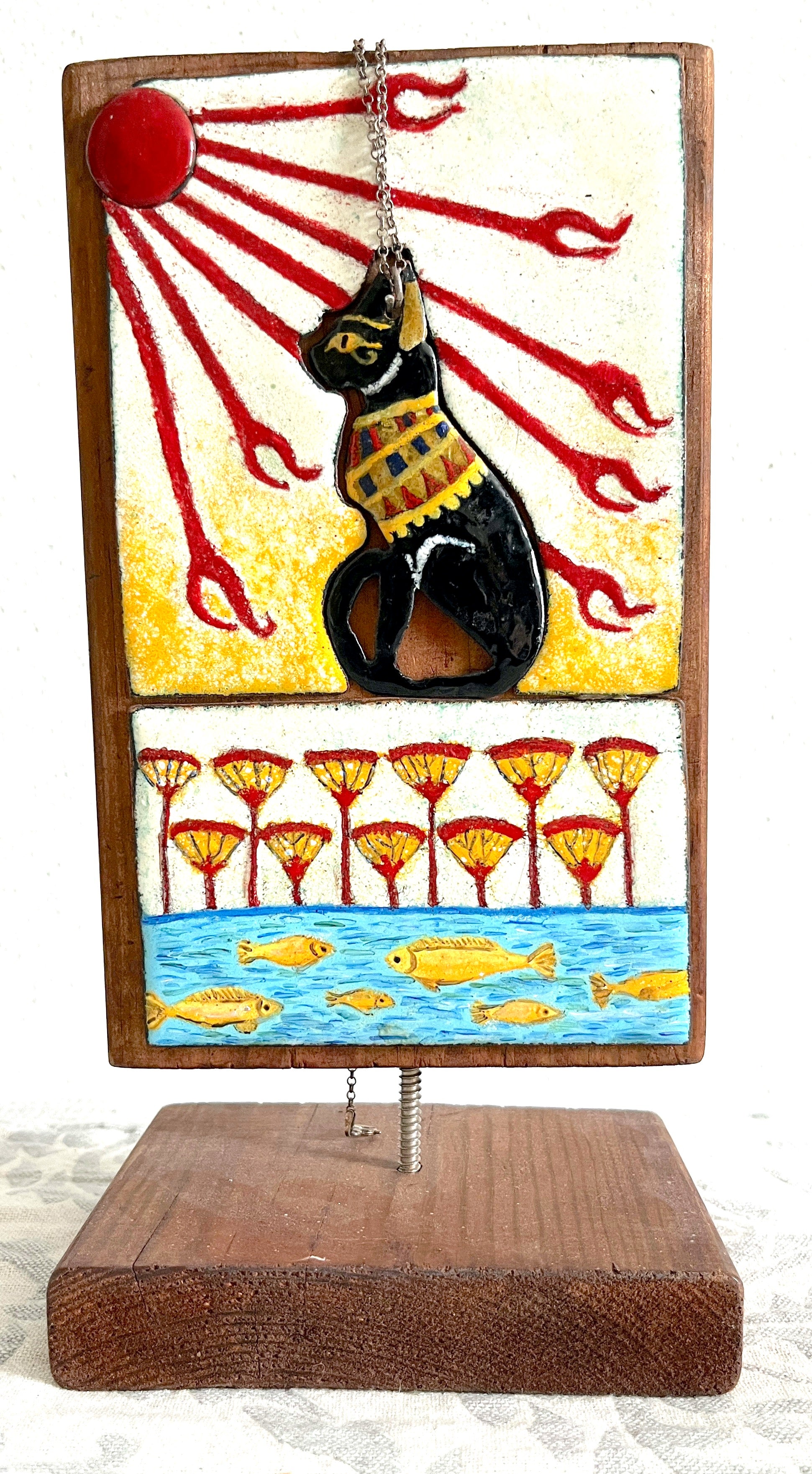 The Sculpture is copper covered with vitreous enamel to give the Egyptian design, the enamel has been fussed over the copper both sides at 1500 degrees F. several times to obtain the bright perfect colors. This plaque is attache to the wood so it can stand up on the wood base.