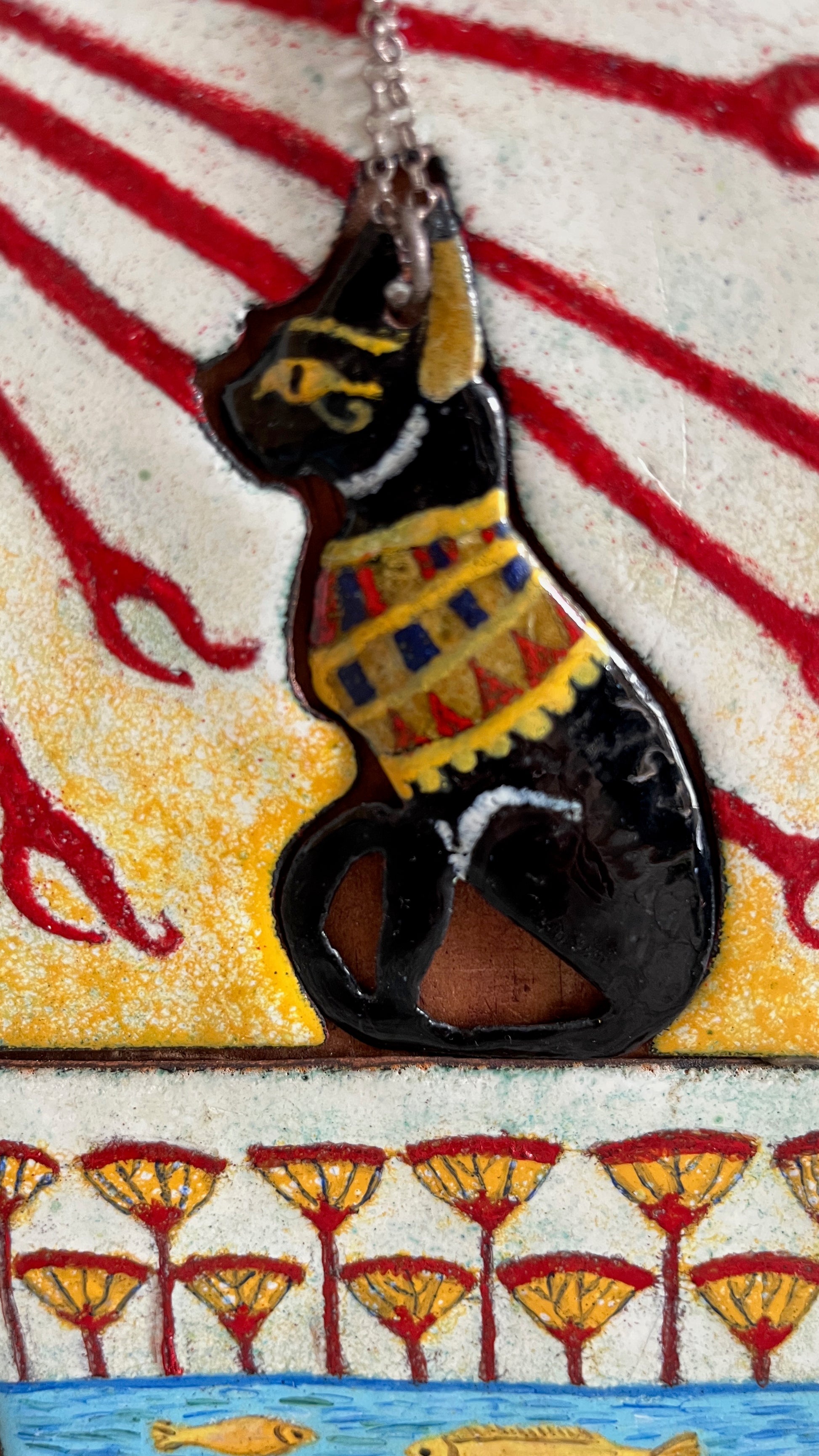 Egyptian Sculpture or plaque standing up , inside the plaque and part of the design is a black goddess cat, this cat can be removed from the plaque to be use like a piece of jewelry.