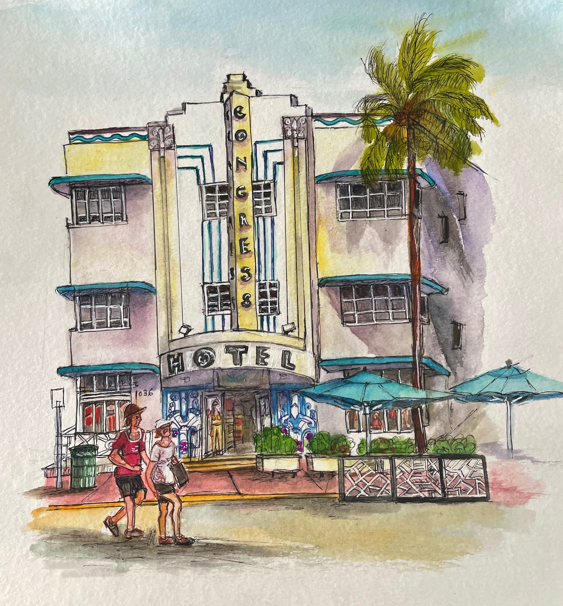 ORIGINAL WATERCOLOR, ART DECO CONGRESS HOTEL, MIAMI BEACH