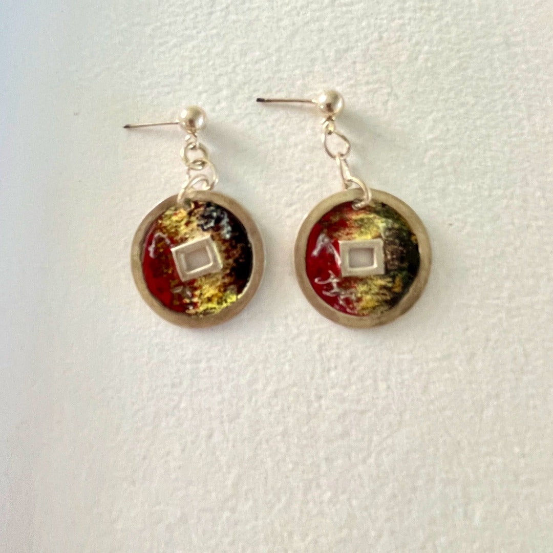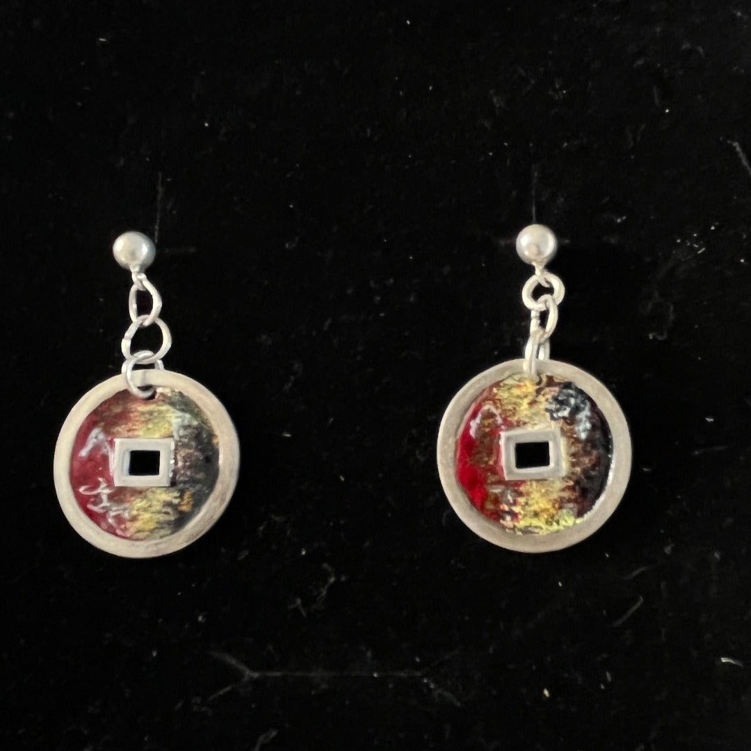Chines Coin, Oriental, Enamel on Silver Earrings