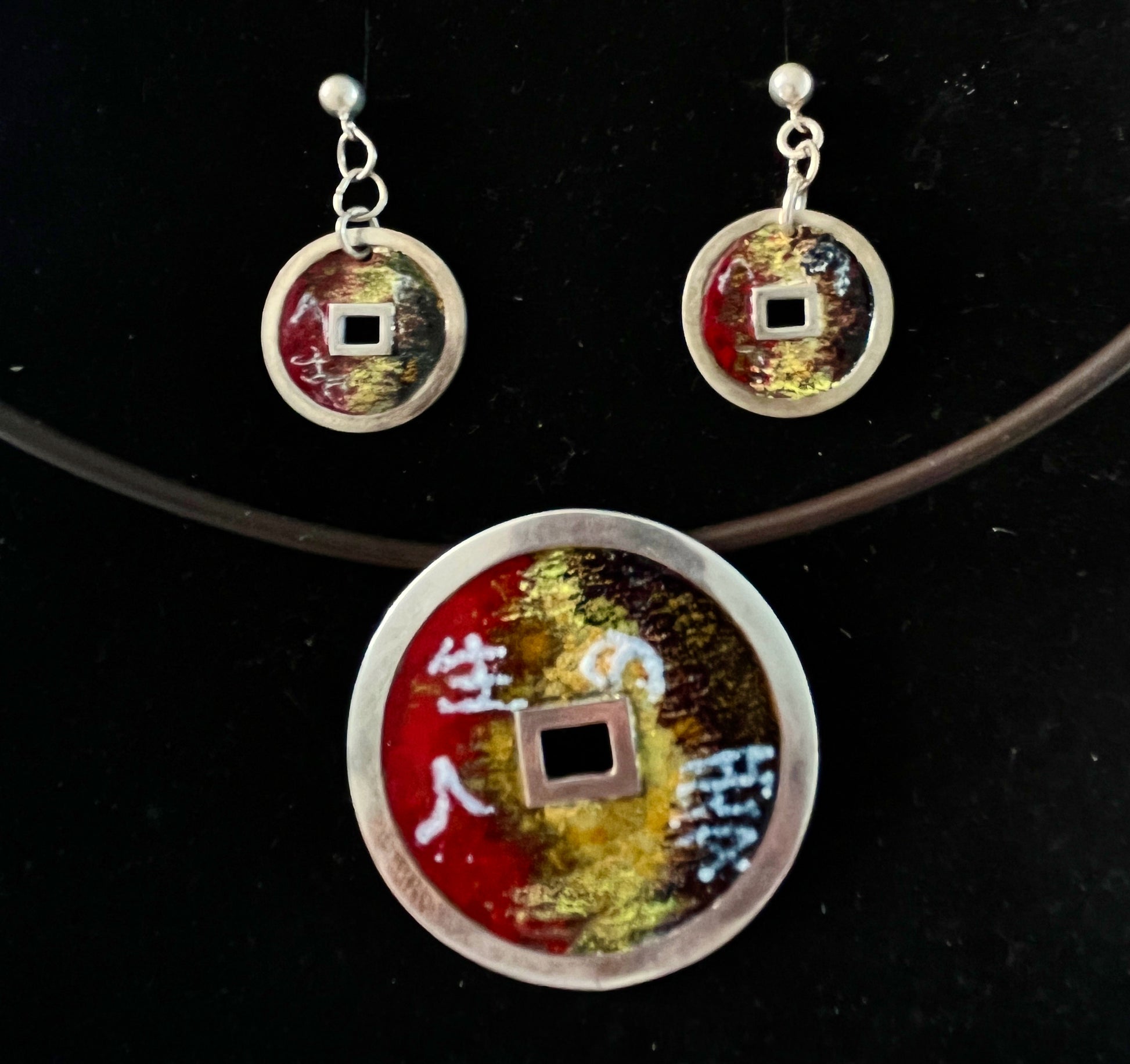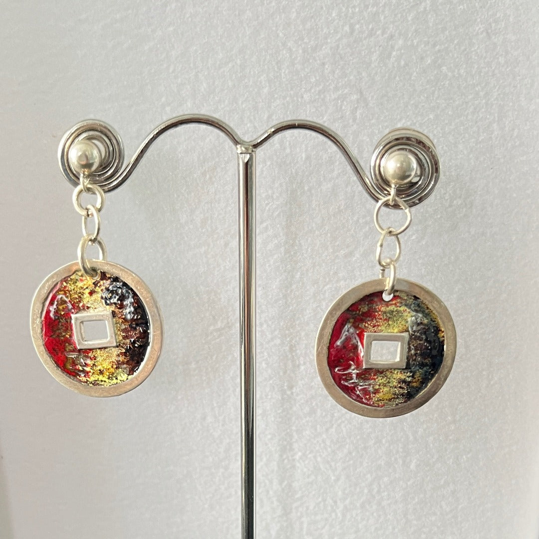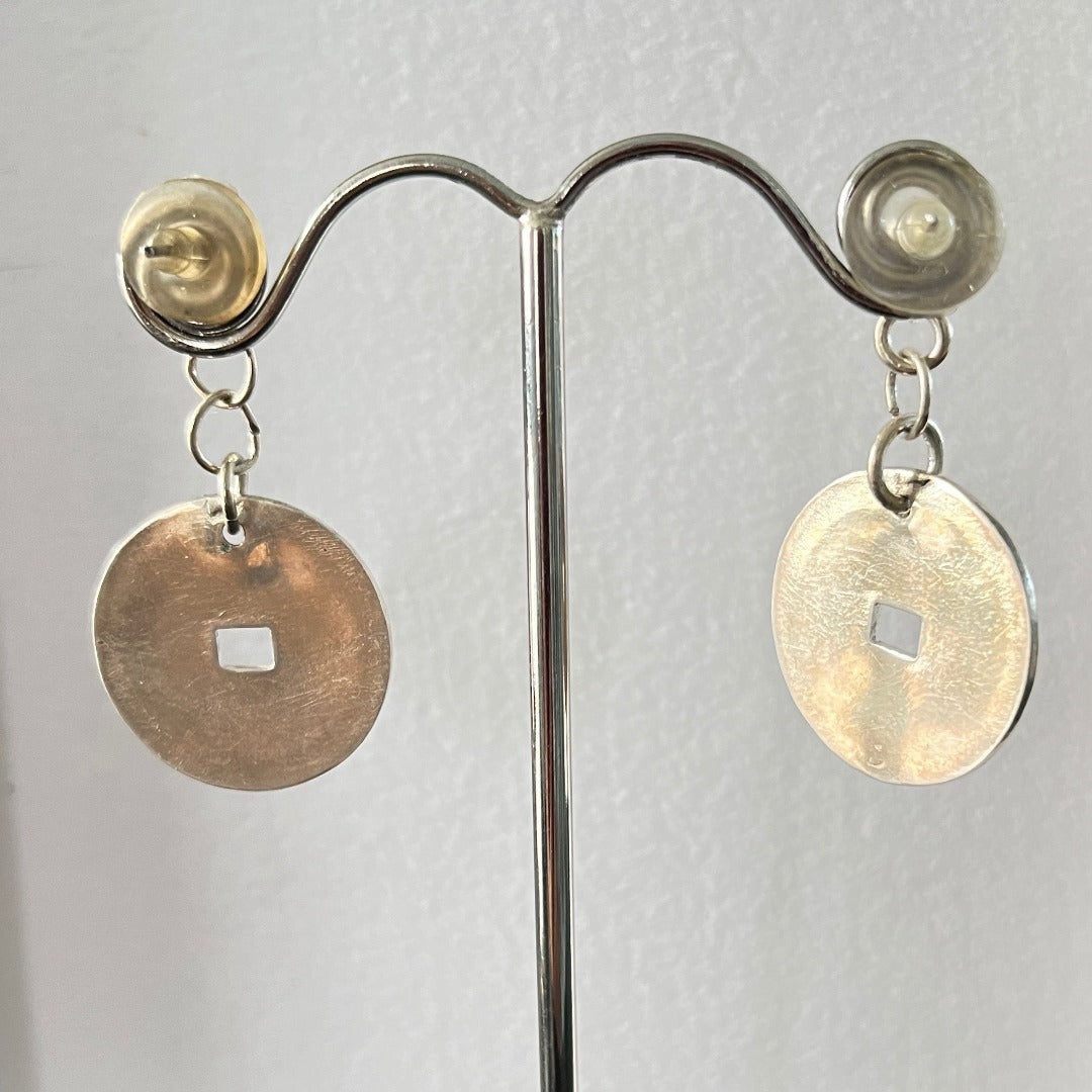 Earrings made with sterling silver with the shape of a chines coin. The designed on top is vitreous enamel fussed on the silver at 1500 degrees F. The design resembles oriental letters.