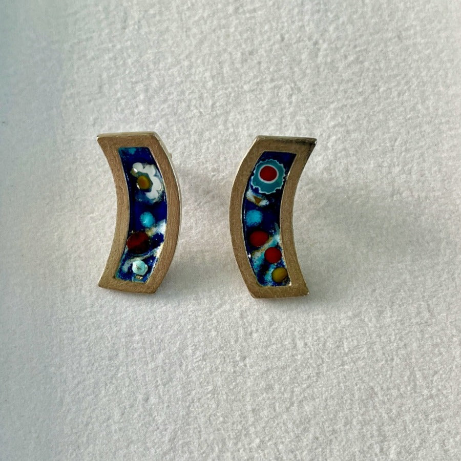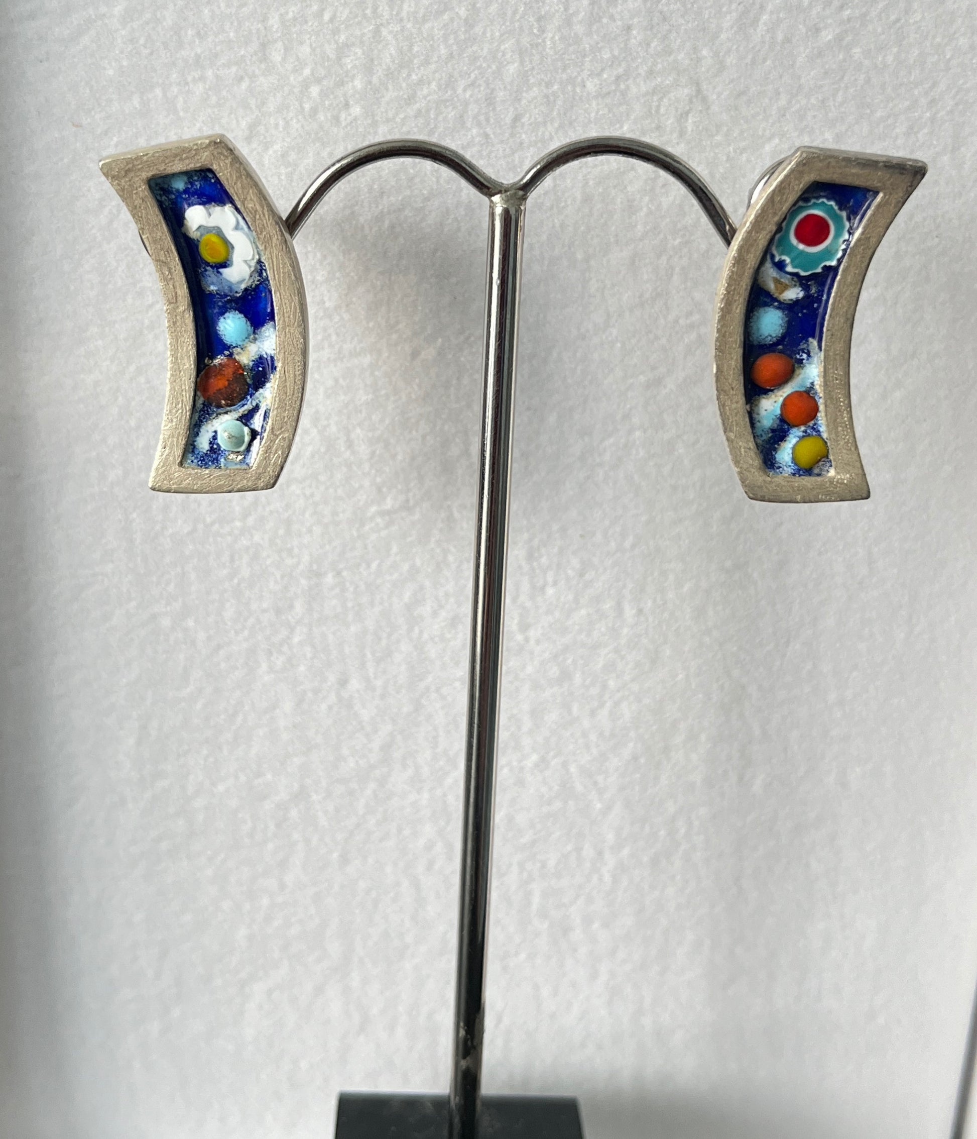 Sterling Silver earrings, my design decorated with vitreous enamel with the hippy flowers.